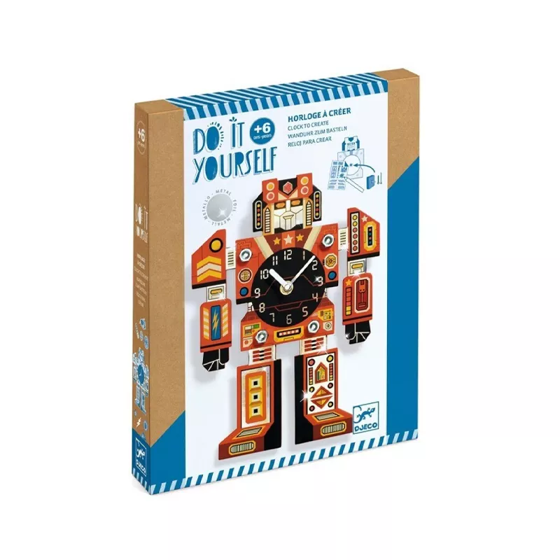 Um kit criativo para criar um relógio divertido para decorar e montar com mais de 100 decalques e acessórios. Só precisas do lápis para esfregar os decalques e transferi-los para as diferentes partes do robô que formarão a estrutura do relógio. Depois, poderás juntar as peças com os parafusos e as porcas incluídos. Só falta montar o mecanismo para ver as horas!