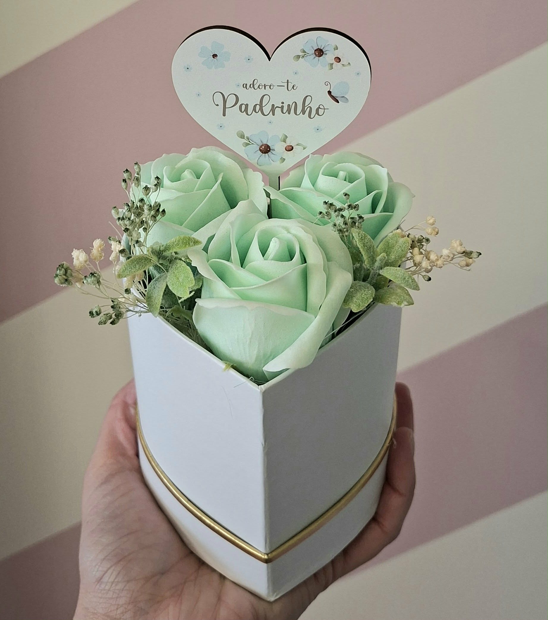 Caixa coração com rosas de sabão – espeto em mdf Adoro-te Padrinho