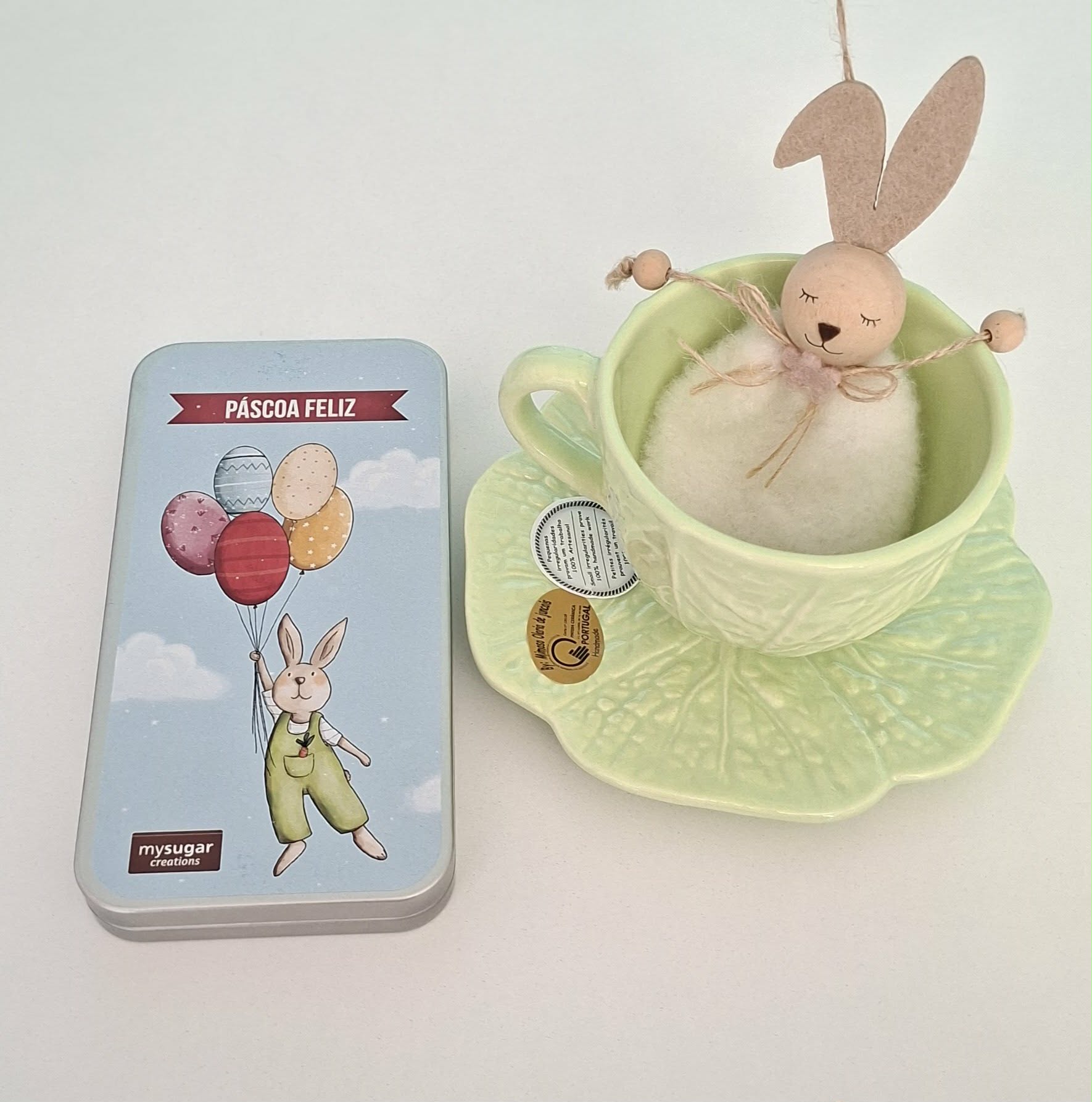 Chávena + Pires verde by mimoso + Lata com chocolate Mysugar = Oferta coelhinho