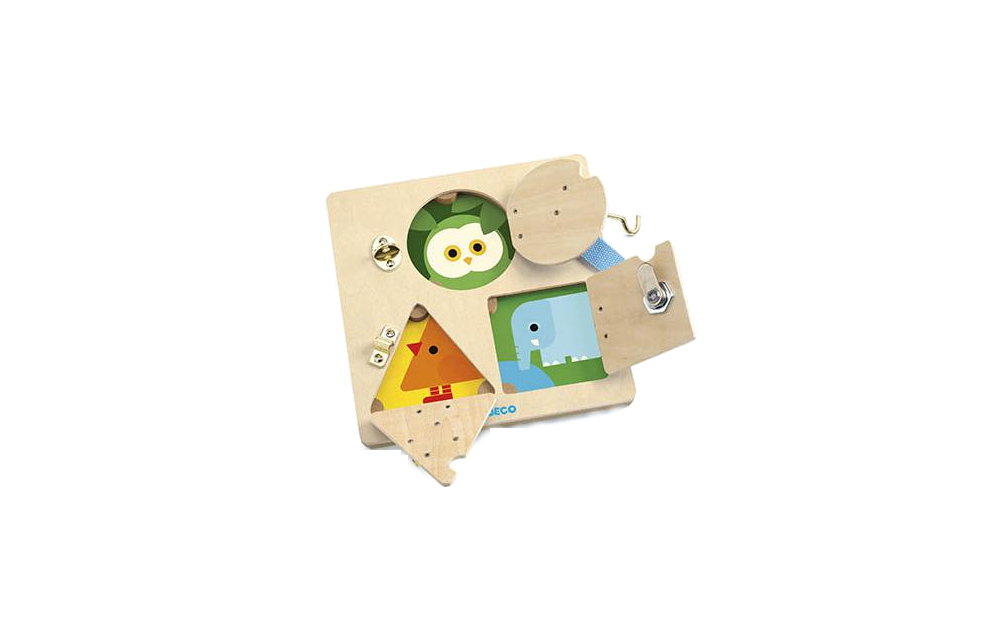 Esta fechadura básica de madeira colorida inclui três fechaduras diferentes em três portas. Descubre como abrir cada fechadura e serás recompensado com uma foto de um animal! Ajuda a desenvolver habilidades motoras finas e coordenação olho-mão.
