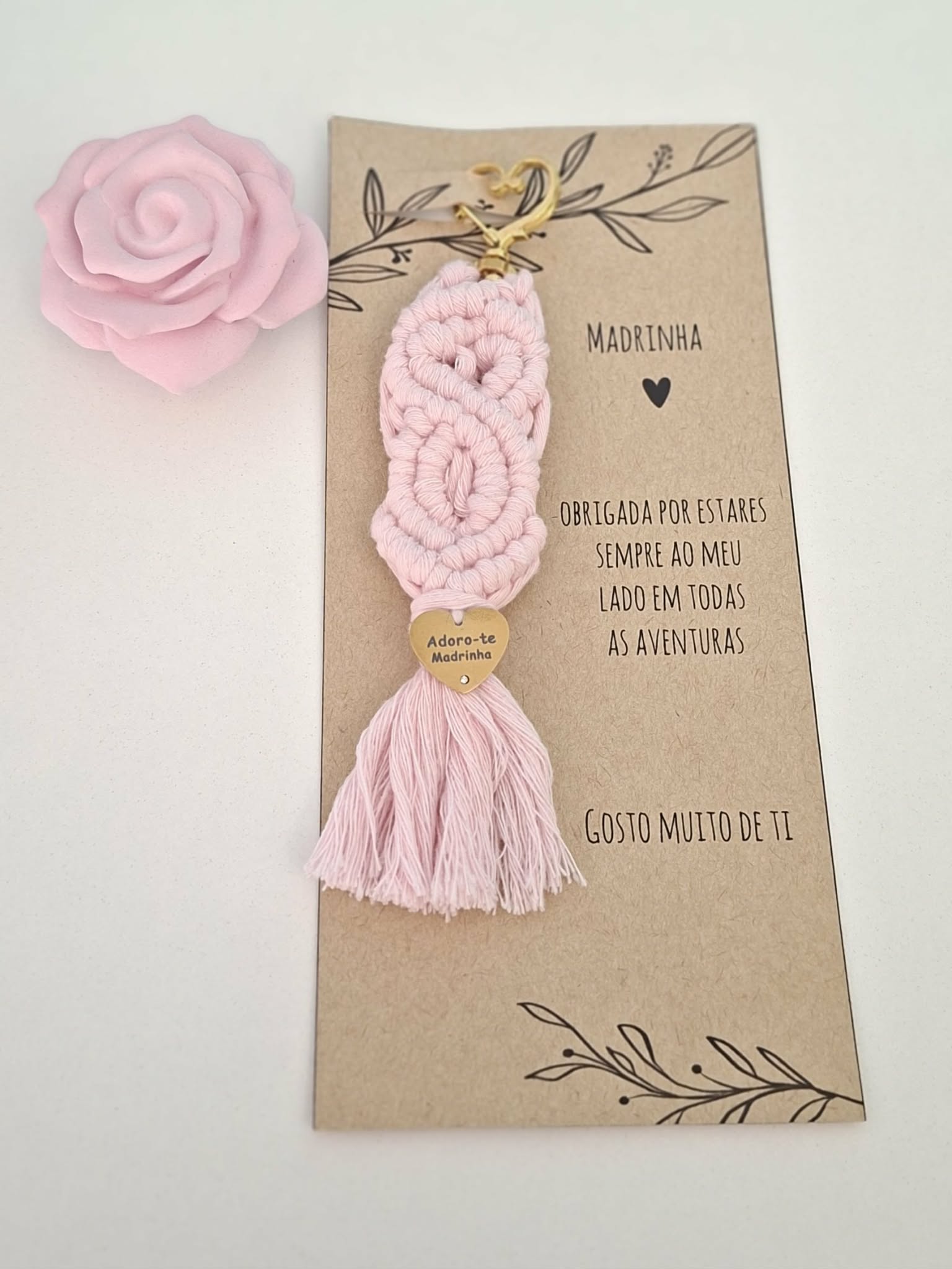 Porta chaves feito em macramé – medalha em aço madrinha.