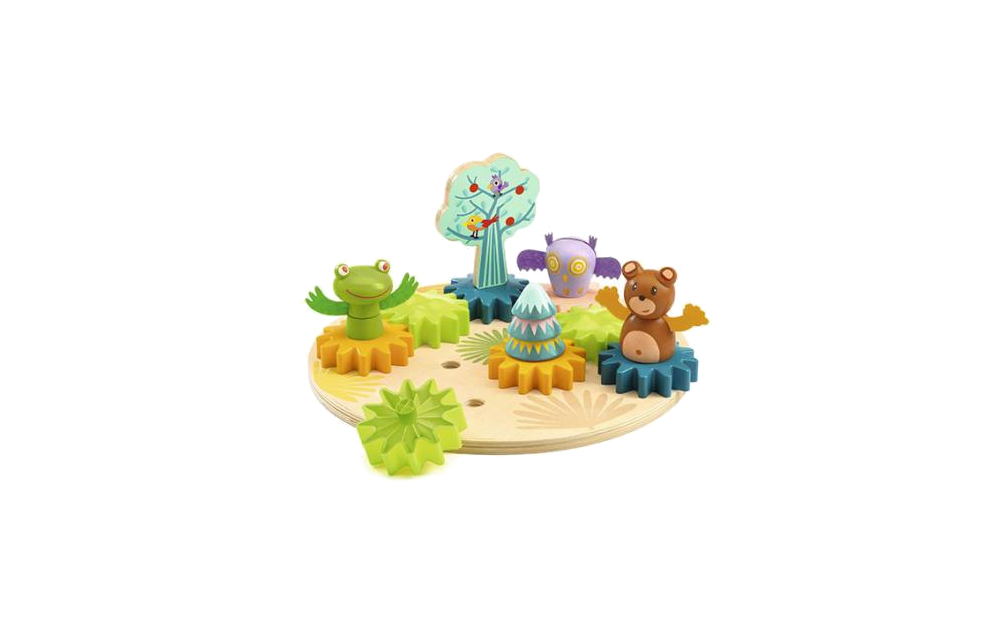 Este é um jogo com base de madeira e engrenagens giratórias. A criança pode projetar o seu próprio cenário de floresta e dar vida aos animais e árvores amigáveis da floresta, manipulando as rodas! Depois, pode mudar a posição das engrenagens e criar um novo cenário, exercitando as habilidades motoras finas.