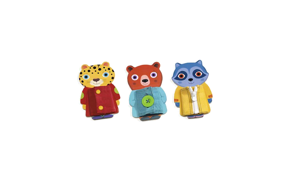 Estes 3 doces animais irão ajudar as crianças a aprender as habilidades do dia a dia. O urso precisa de ter o seu casaco abotoado, o casaco do leopardo precisa de ser fechado e o casaco do guaxinim precisa ser fechado com um fecho. Uma maneira divertida de aprender habilidades de autoajuda.